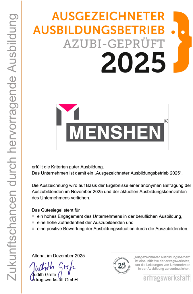 Also this year, Georg Menshen GmbH & Co.KG is once again being awarded the quality seal ‘Excellent Training Company’ for the outstanding quality of its training. In an anonymous survey, the apprentices answered around 100 detailed questions about the quality of their training. Topics included, among other, the training content, the treatment of apprentices in the company, and future prospects.